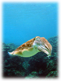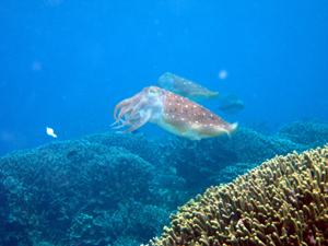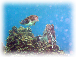 講習のお二人さんも、ファンのリツコさんも、 コブシメのペアをしっかり見るコツが出来ました〜\(^○^)/ 。 「でっかーーーい・・・」と言うのがみんなの感想。 オスとメスとの違いを説明しつつ観察です。 今日はダイバーが多かったせいか・・コブシメはちょっと落ち着かないようでした。