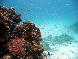そして、ドロップオフに移動〜。水は抜けていなかったけど、今日は魚影がやたら濃い日でした。ハナゴンベの数は相変わらずタクサン。ぐるくんの群にカスミチョウチョウウオやアカヒメジ、ノコギリダイの群・・。アーチを抜けるとスゴイ数のオヤビッチャが必死に孵化寸前の卵たちを守っていました。少しうねりがあったけど、あえてゼブラハゼやクロユリハゼ、ニジハギが群れる浅瀬へ・・・。小さなモンツキカエルウオを見つけたけど、やっぱりうねりに撃沈・・・写真に撮るのはムリっ!!