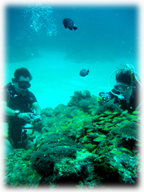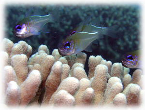 ココでは、浅瀬にひょっこりモンツキカエルウオ、グルクンの群にヨスジフエダイの群、 そして・・レアなバイオレットボクサーシュリンプを発見っ! ・・・だけど、すぐ奥に入ってしまったそうです・・・。