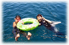 体験のお二人とノゾミさんは・・まずはナオちゃんと一緒に説明を受けながらシュノーケリングで水慣れから・・少しずつ・・。