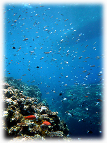 ここでは、ハナゴイの群、キンギョハナダイの群、グルクマの群の補食シーン、ハタタテハゼのコロニー、