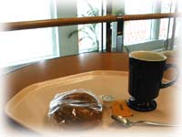 空港のカフェで、ベーグルとコーヒーの朝食。