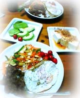 健康を意識した今日のメニューは・・・鶏と卵のさっぱり煮・プチトマト・豆腐と