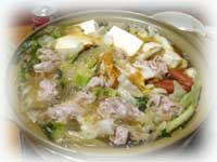 おダシに、ニンニクと鷹の爪がたっぷり入った栄養満点台風鍋〜。