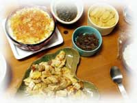 今日の遅い晩ゴハンは・・・。 ・マカロニグラタン ・タラシ揚げの炒めピパーチ風味 ・メカブトロロ ・オクラ納豆・・などなど・・。